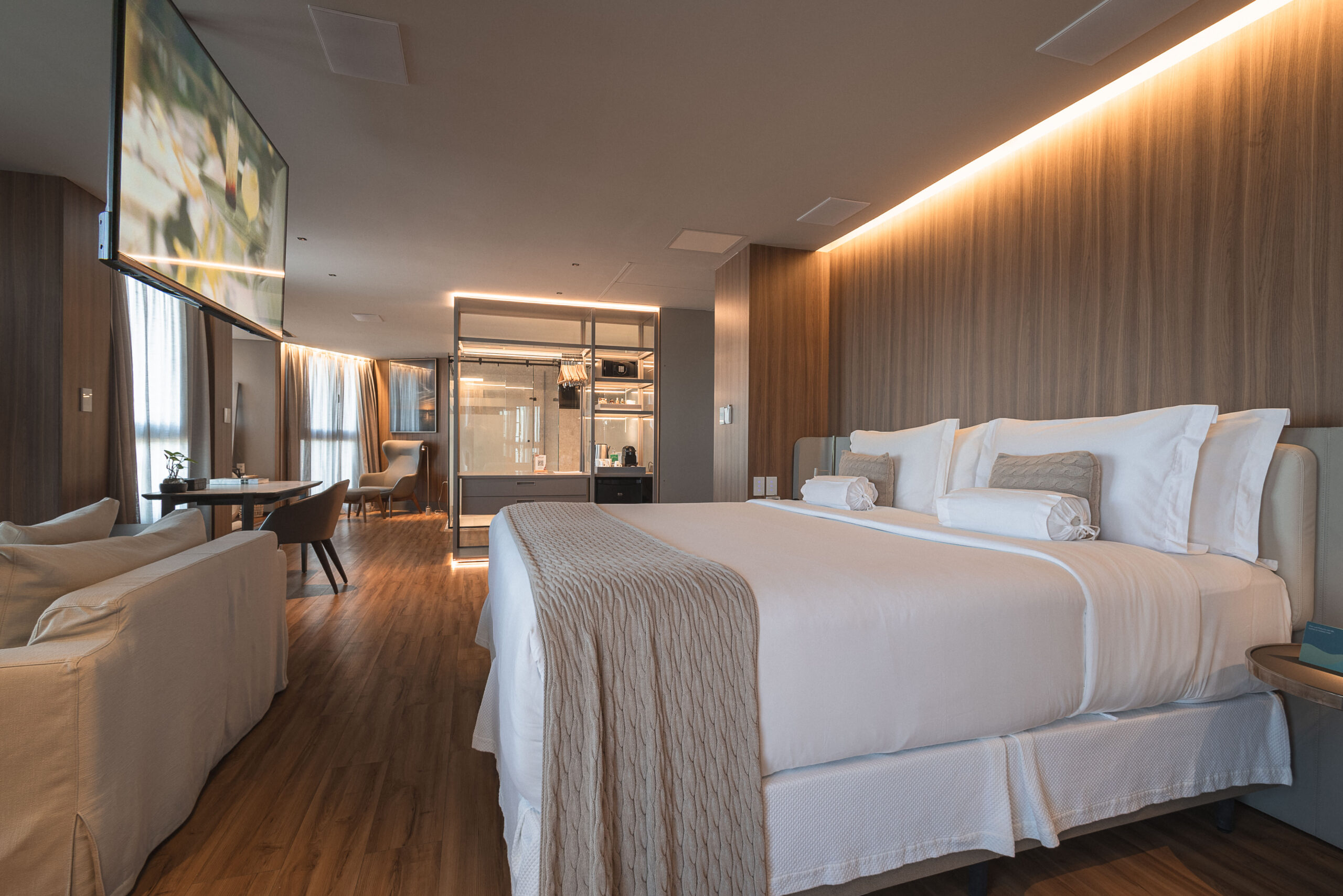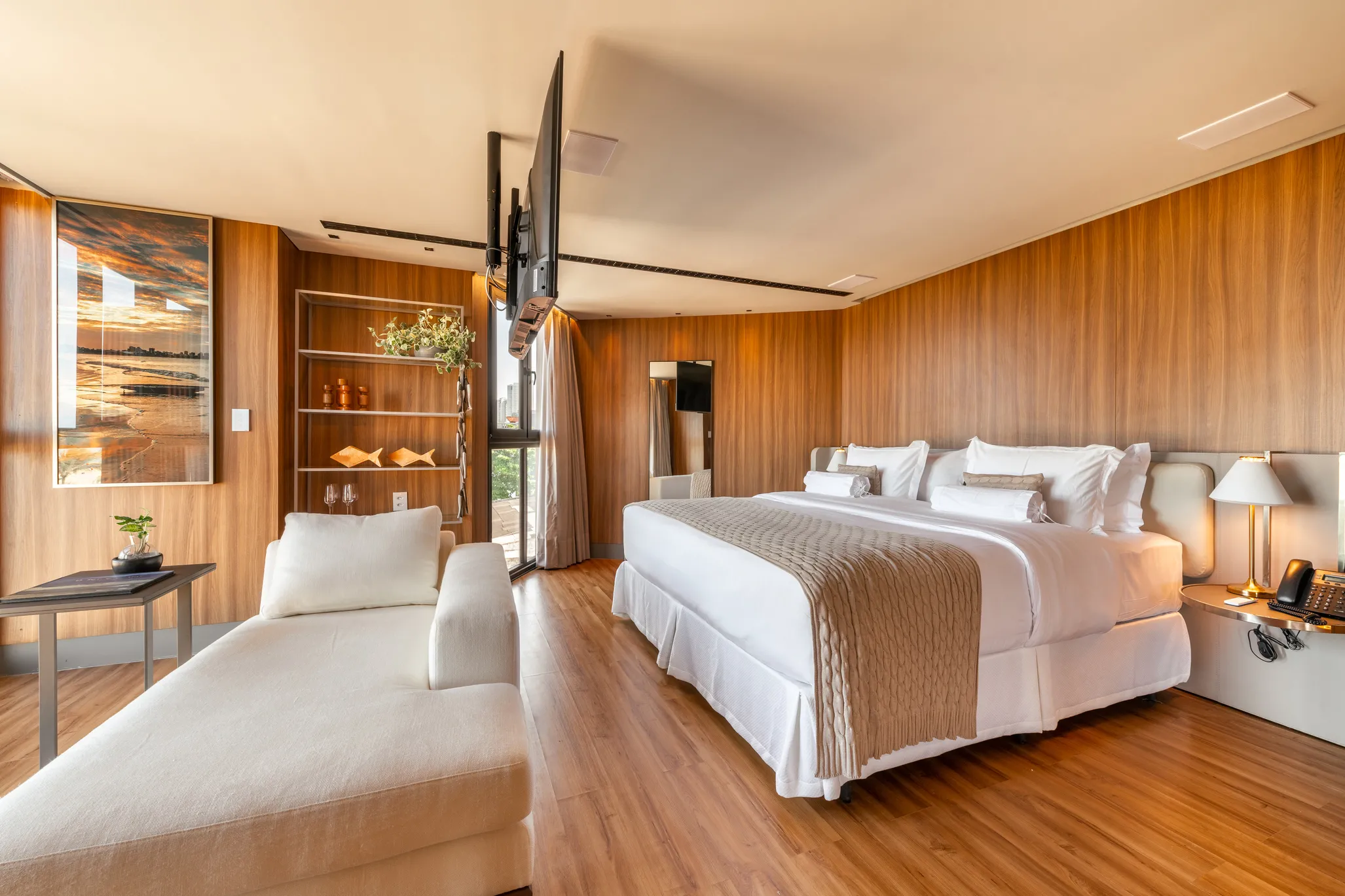 Seu refúgio à beira-mar com muito aconchego. Em 22 m² de acolhimento, sinta a brisa suave que entra pela janela e descanse em uma cama king-size, com lençóis Trousseau que abraça o corpo após um dia explorando a cidade. Desperte renovado, com o aroma do café São Braz fresco e o conforto dos amenities 100% veganos.