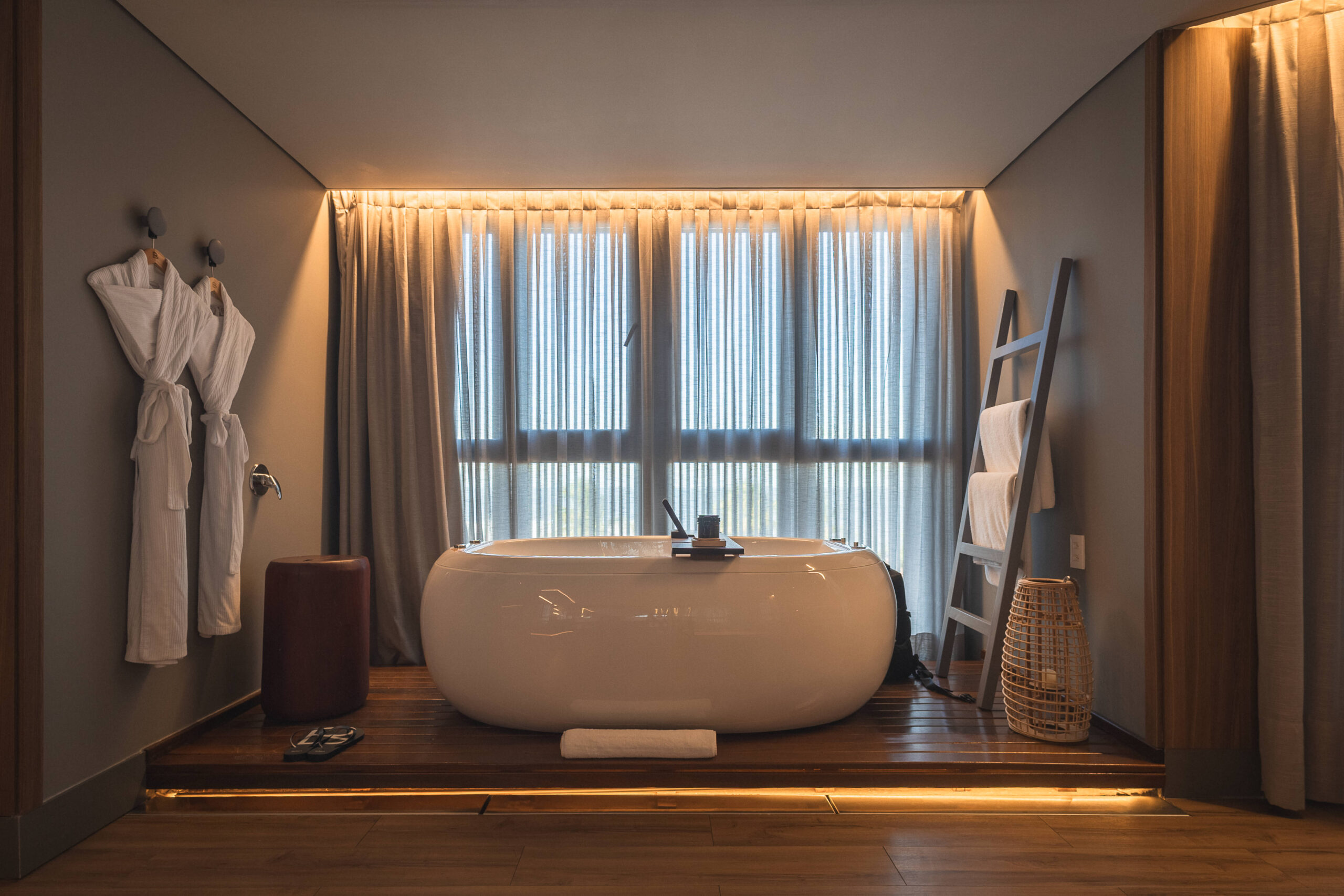 Espaço para viver a viagem a dois ou em família. Este apartamento convida ao convívio: a luz natural envolve e acolhe o cenário para conversas e descanso. A vista lateral do mar completa o ambiente, enquanto o aroma dos amenities 100 % veganos embala o início de um banho relaxante. Um espaço para desacelerar e curtir o momento.