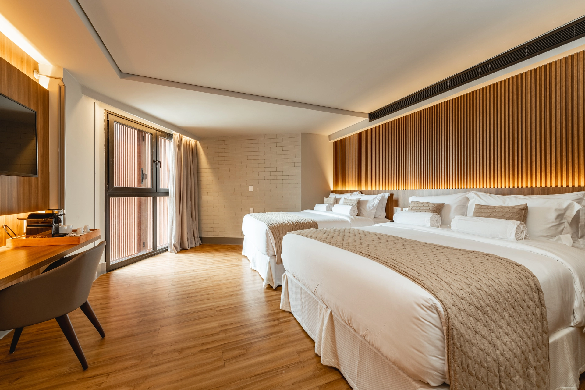 Envolto pela natureza e cercado de conforto, assim é a suíte Tropical. Um convite para desfrutar o bem-estar e a praticidade. Ideal para até 4 pessoas, com duas confortáveis camas queen, janelas amplas com vista para o jardim suspenso e uma experiência urbana com alma natural.